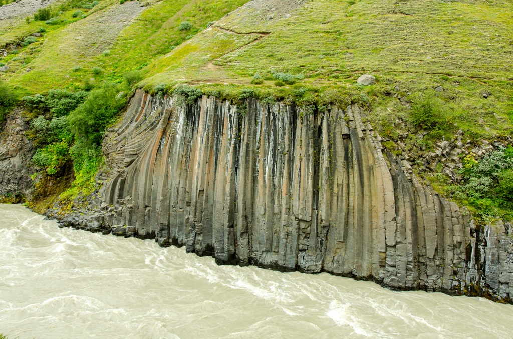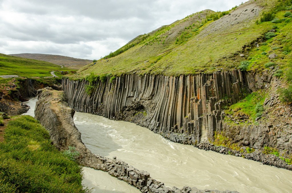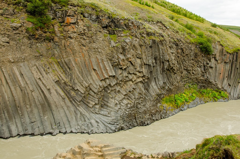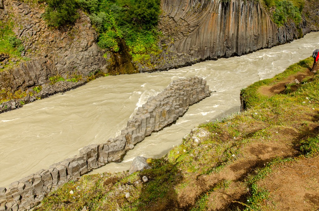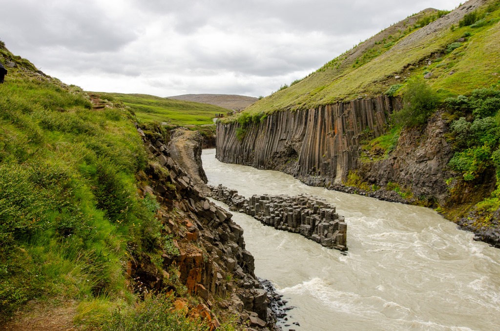 Vi körde inte ända fram tillparkeringen utan stannade vid en parkering en bit före. Jag plockade loss cyklarna så cyklade vi de sista 2,5 km till ett cafe. Där ställde vi cyklarna och gick de sista 2,2 km ner till Studlagil. Riktigt häftiga Basalt pelare nere i floden. Det var mycket vatten i floden så vattnet var ganska grått idag.