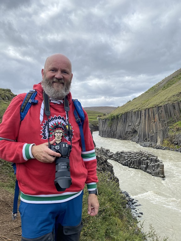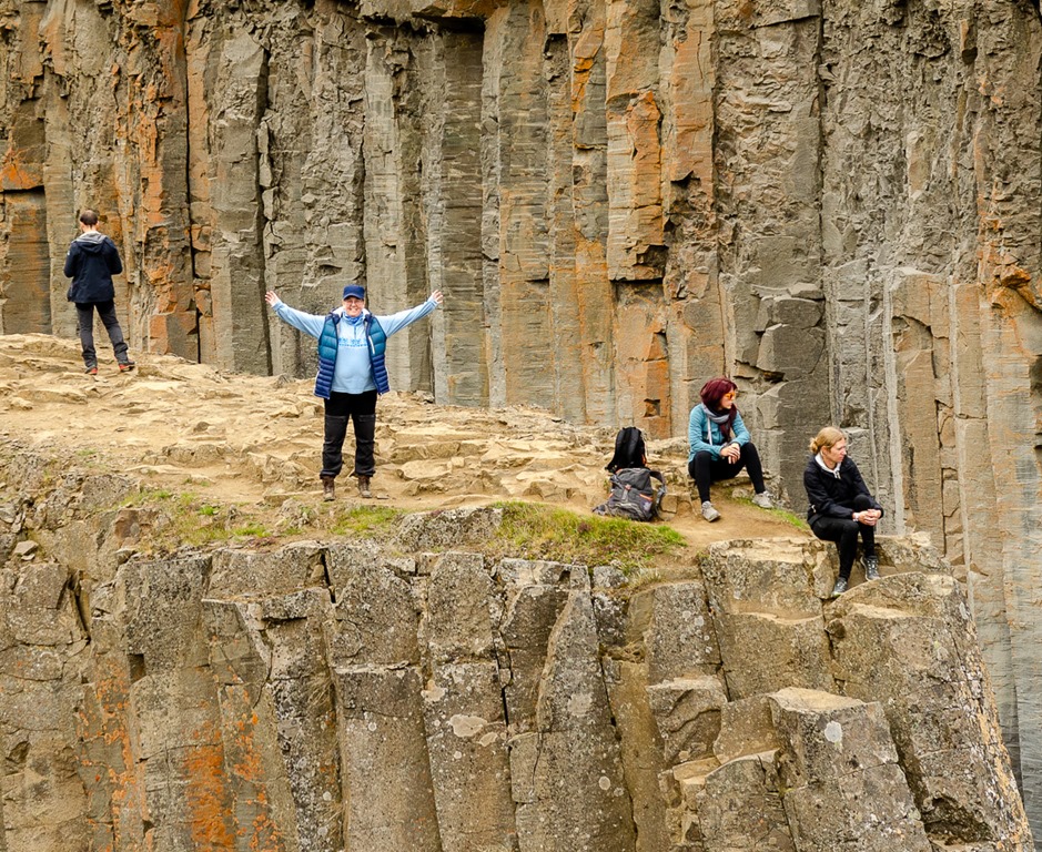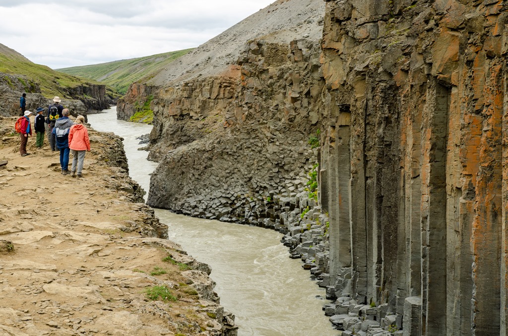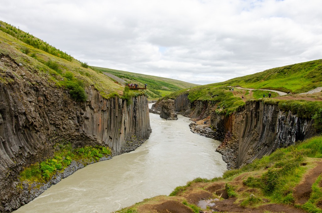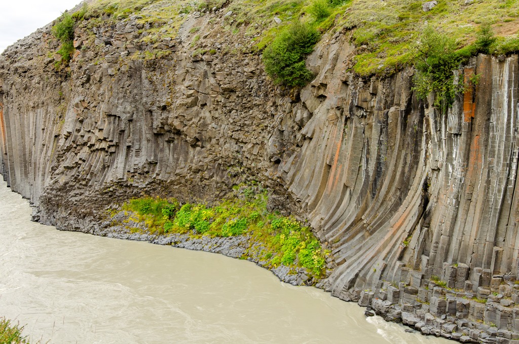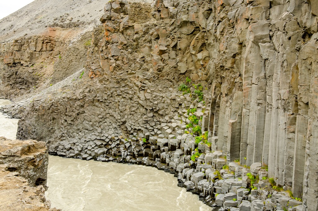 Vi körde inte ända fram tillparkeringen utan stannade vid en parkering en bit före. Jag plockade loss cyklarna så cyklade vi de sista 2,5 km till ett cafe. Där ställde vi cyklarna och gick de sista 2,2 km ner till Studlagil. Riktigt häftiga Basalt pelare nere i floden. Det var mycket vatten i floden så vattnet var ganska grått idag.