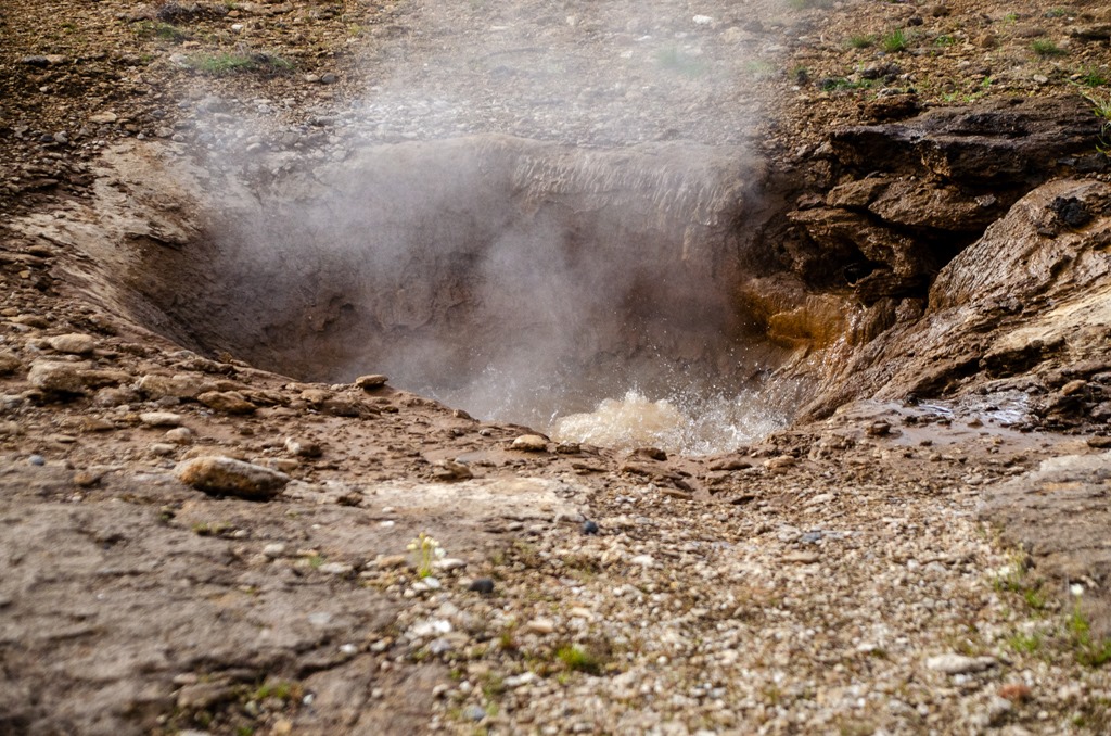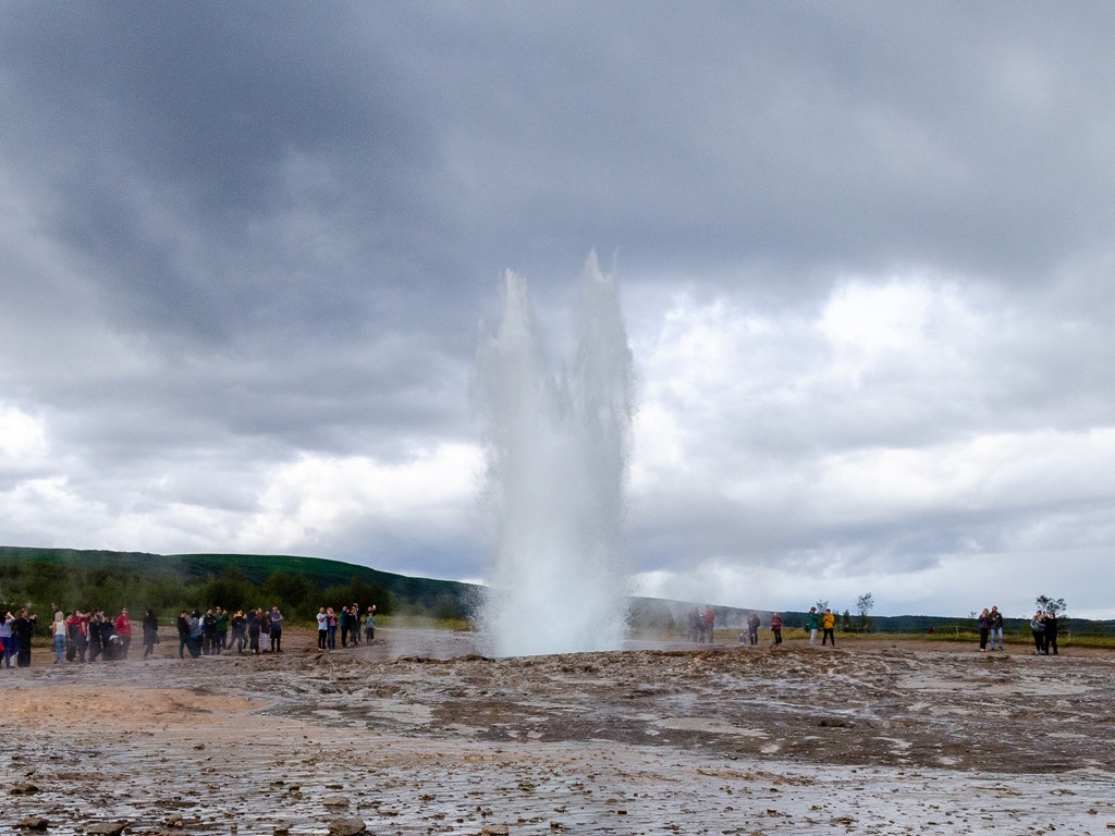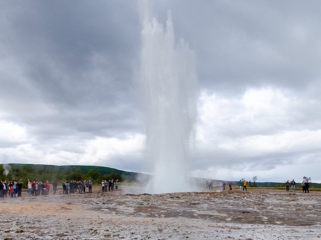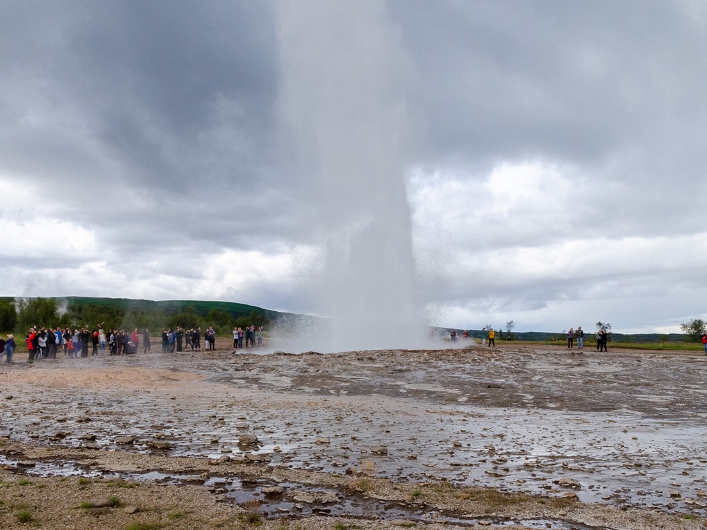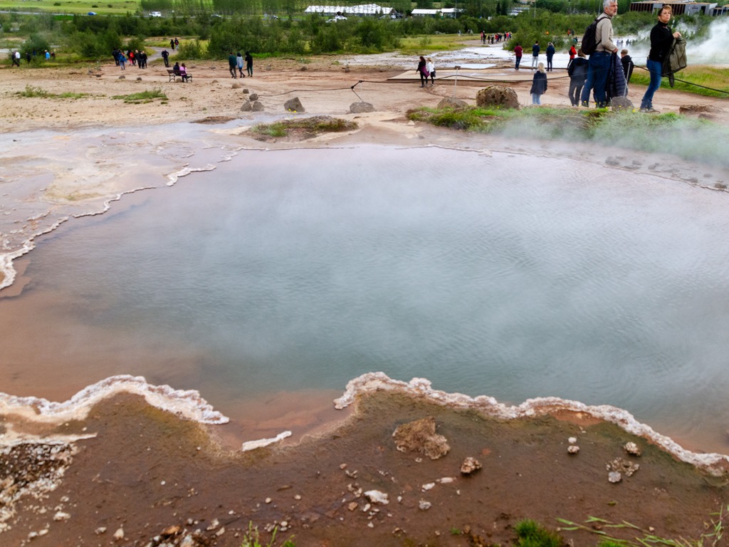 Vi kör upp till Geysir där det ligger en camping. Där parkerar vi för dagen och tar en kopp kaffe innan vi går bort för att se utblåset från Geysern som är aktiv.