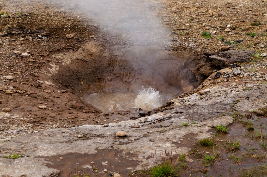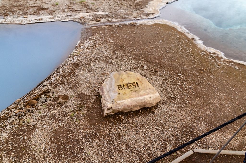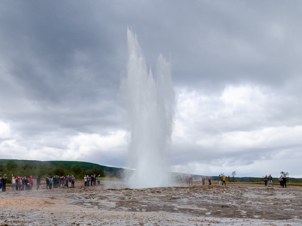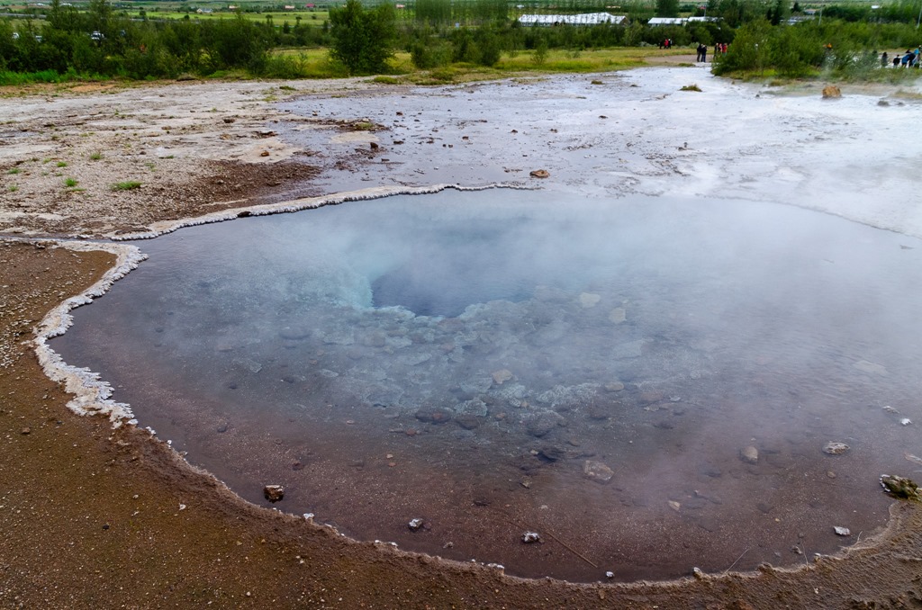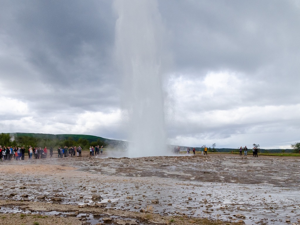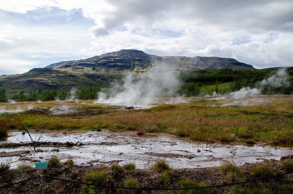 Vi kör upp till Geysir där det ligger en camping. Där parkerar vi för dagen och tar en kopp kaffe innan vi går bort för att se utblåset från Geysern som är aktiv.