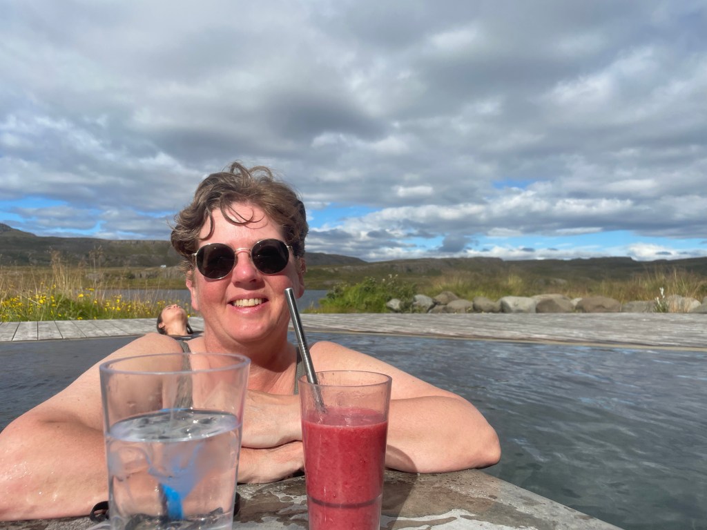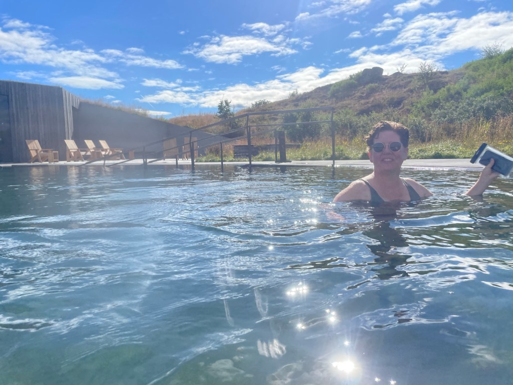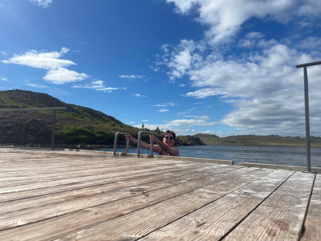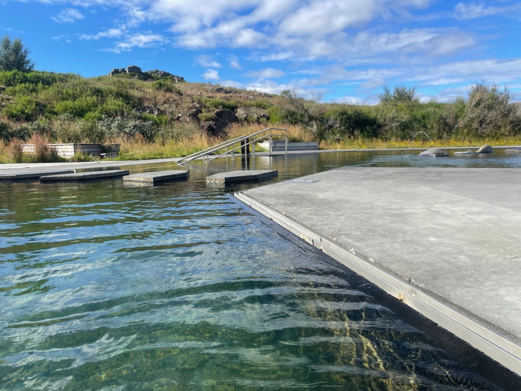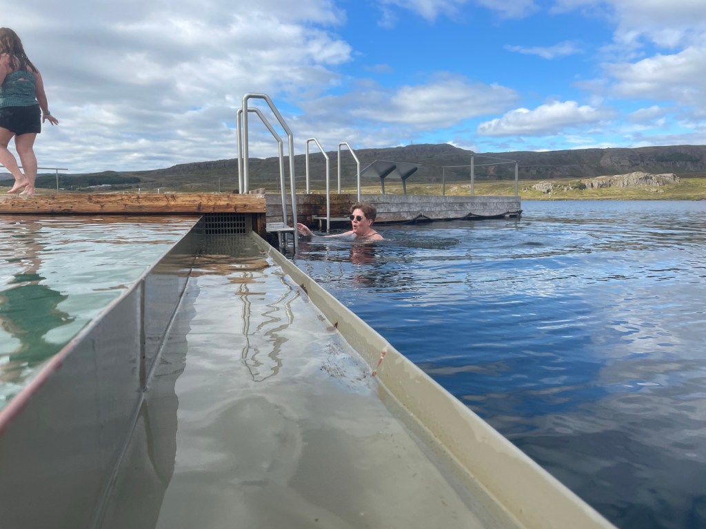 Vi fortsatte sedan på väg 1 upp till Vök thermal bath. Där gick vi in för att bada lite.