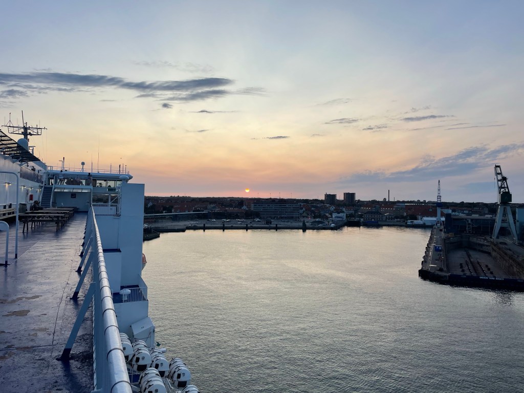 Jag går sedan upp till övre däck där Britta sitter och väntar. Vi ser att färjan närmar sig Hirtshals.
