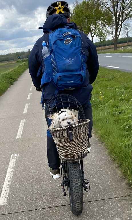 Vi hade med oss fika men hittade ingen riktigt bra plats att stanna på. Så det blev lite kaffe när vi var tillbaka vid husbilen efter 27 km cyklande. Vilken tur att vi skaffat el cyklar.