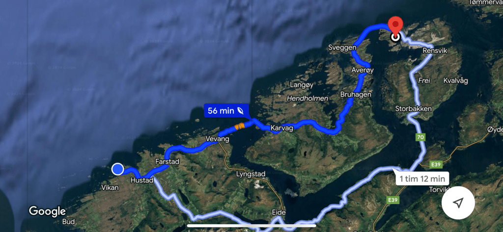 Vi började leta Fricamping där vi kunde fiska och kanske bada. Det hittade vi till slut ute på Askevågen. En parkeringsplats längst ut mot havet.