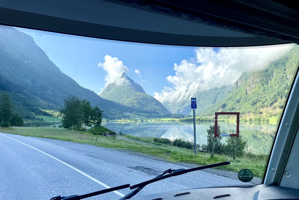 Passerar Loen och det ligger en kryssningsbåt ankrad utanför och vi ser att molnen ligger väldigt lågt ännu.