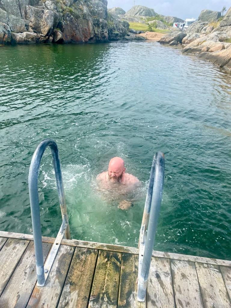 Vi bestämde oss för att ta ett dopp. Det var 16 grader i vattnet enligt termometern.