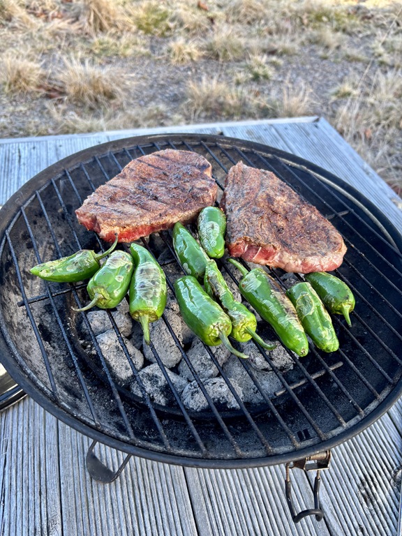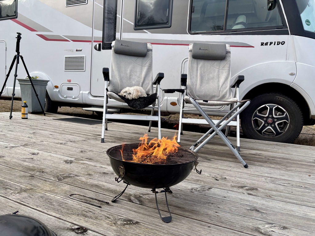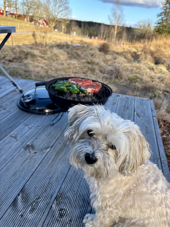 På eftermiddagen så satt jag utanför och drack kaffe och Chili fick en egen stol. Till kvällen blev det grillad korv.