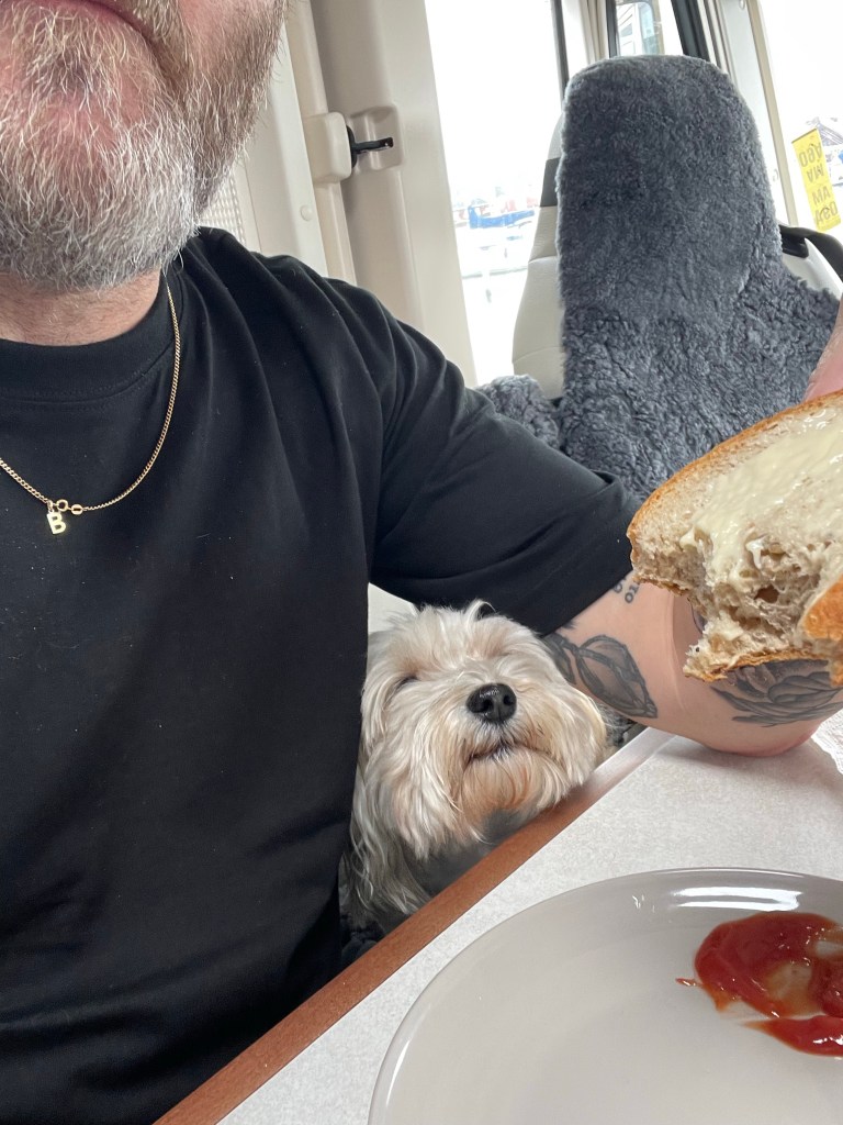 Där stannar vi och rastar Chilli och jag går för att köpa varsin portion fish and chips.